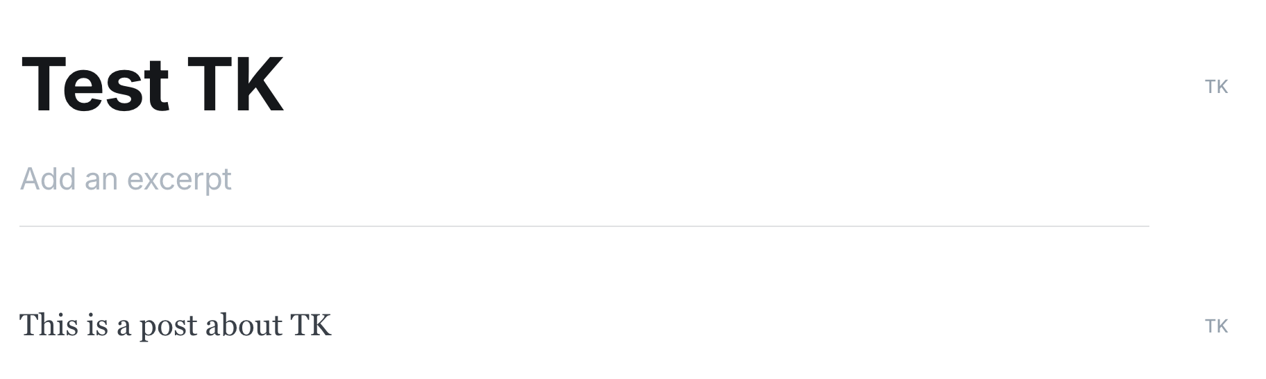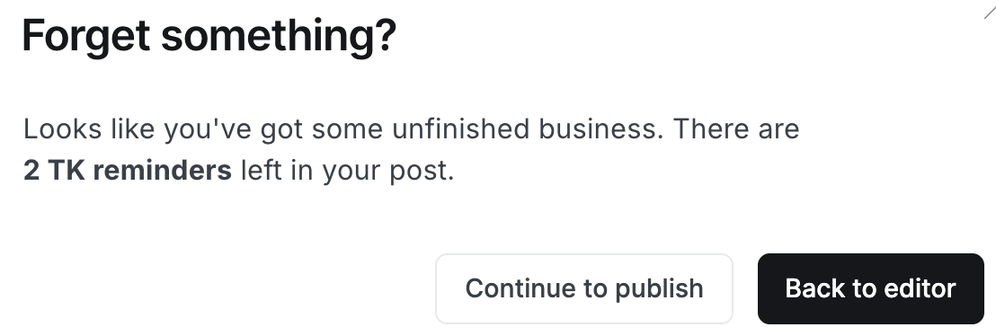 If there are any TKs left in the text a warning will also be triggered when you go to publish a post: